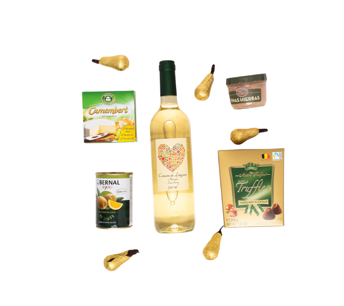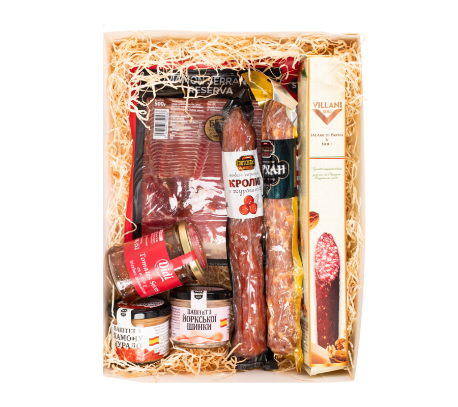 1.Подарункова корзина 2.Подарункове пакування товару 3.Сир Янтар 200 г (Пармезан) Польща 4.Спаржа Didi с/б 180 г 5.Помідори в'ялені Polli 190 6.Лосось BayMar на грилі в оливковій олії 160 г 7.Хвіст креветки 220 г Plazachica 8.Паштет зі свинини з вином Pedro Ximenez TM PATA NEGRA 110 г 9.Олія оливкова Monini Extra Vergin з розмарином 250 мл 10.Печиво Anthon Berg в асортим.175/192,5 г 11.Вино Італії Frappato Shiraz IGT, Lignum Vitis, ЧЕР, Сух, 0.75 л 12.Шоколад Arne чорний 57% з мигдалем та грушею 100г 13.Хамон Subirats JAMON SERRANO в/у нарізка 100 г Кошик тепла, радості та солодких митей для чарівних святкових моментів.