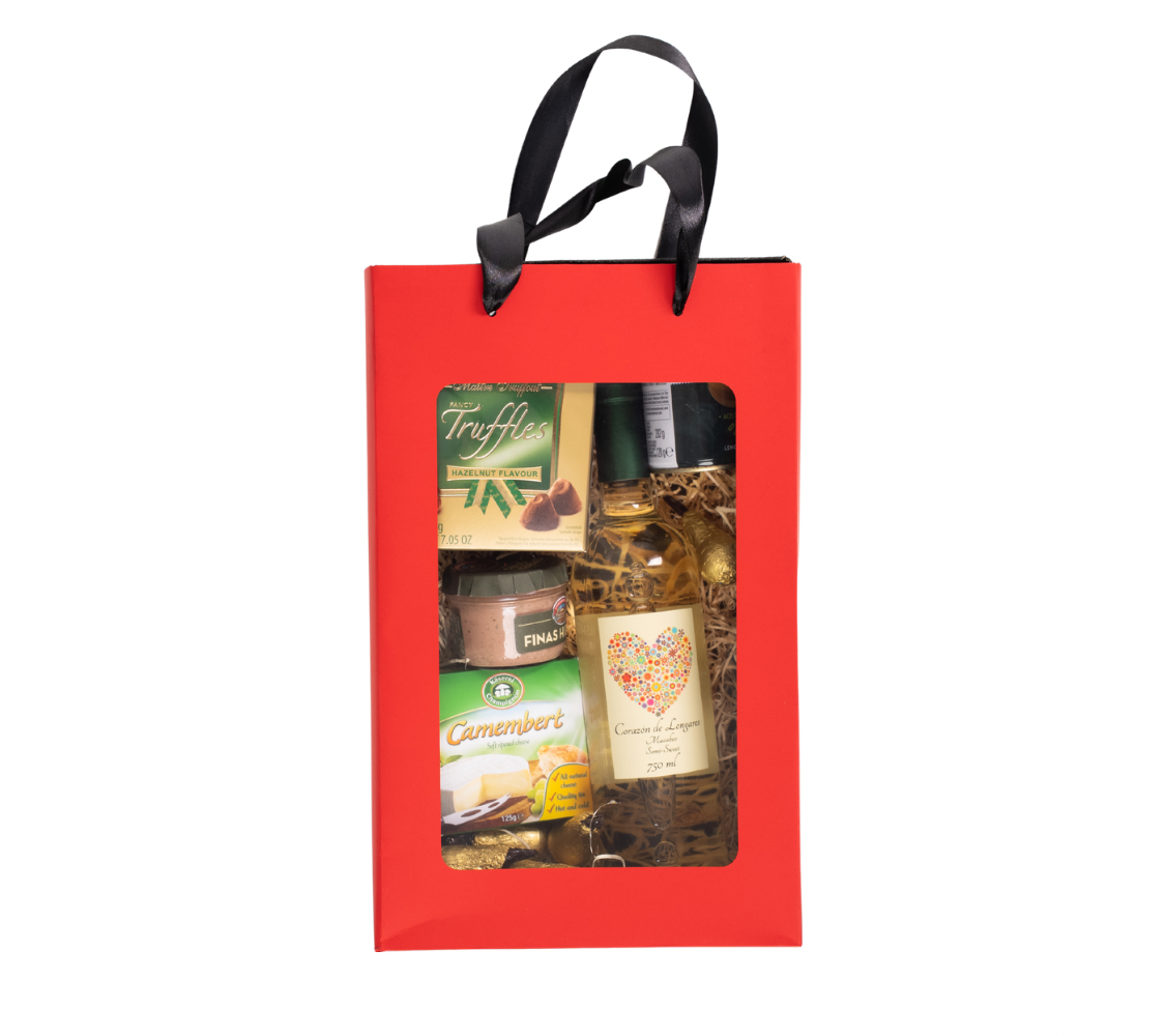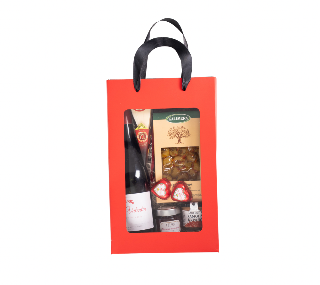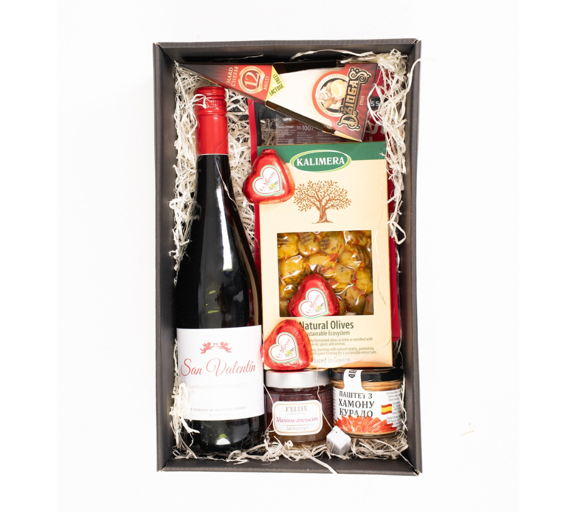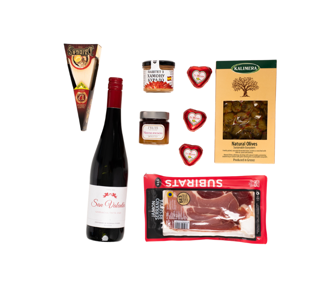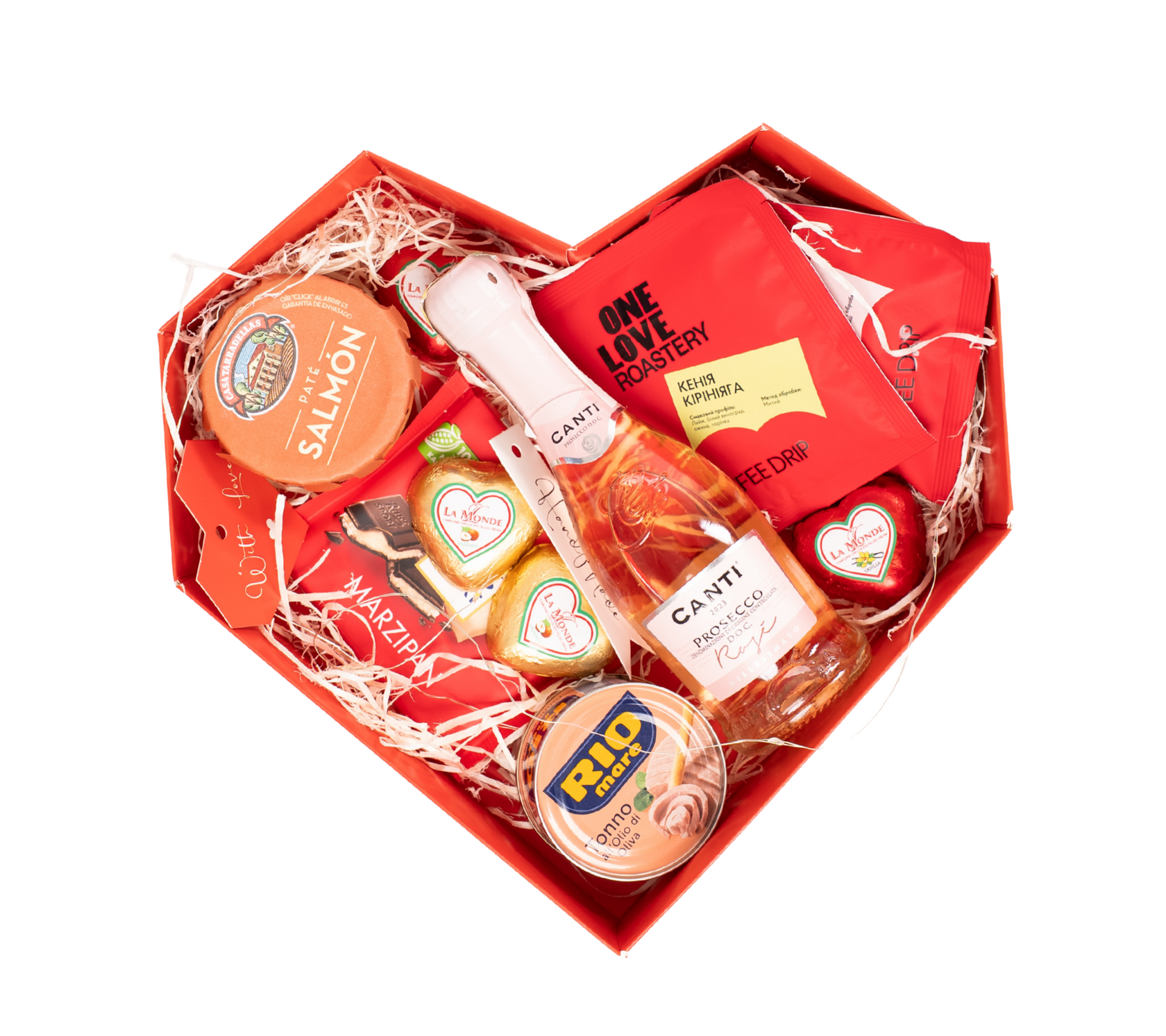 1.Подарункове пакування товару 2.Гірлянда 2 м 3.Коробка СЕРЦЕ 4.Вино ігристе Deor "Cuvée Bianco Gold Spumante Extra Dry" (екстрасухе, біле) 0.75л 5.Цукерки Chocolates excelcium tradition 100г 6.Сир Парміджано Реджано DOP 40 міс 250 г 7.Чіпси Meltie шоколадні в асортименті 125 г 8.Кава ILLY Guatemala 250 г 9.Паштет зі свинини з сиром roquefort TM PATA NEGRA 110 г 10.Філе тунця Amo Essere Альбакор в оливковій олії 200г (скло) 11.Макарони з тв.сортів пшениці з чорнилом каракатиці Spaghetti al Nero di Seppia 500 12. Троянди червоні 19 шт Насолода для серця і смаку, щоб порадувати особливу людину.