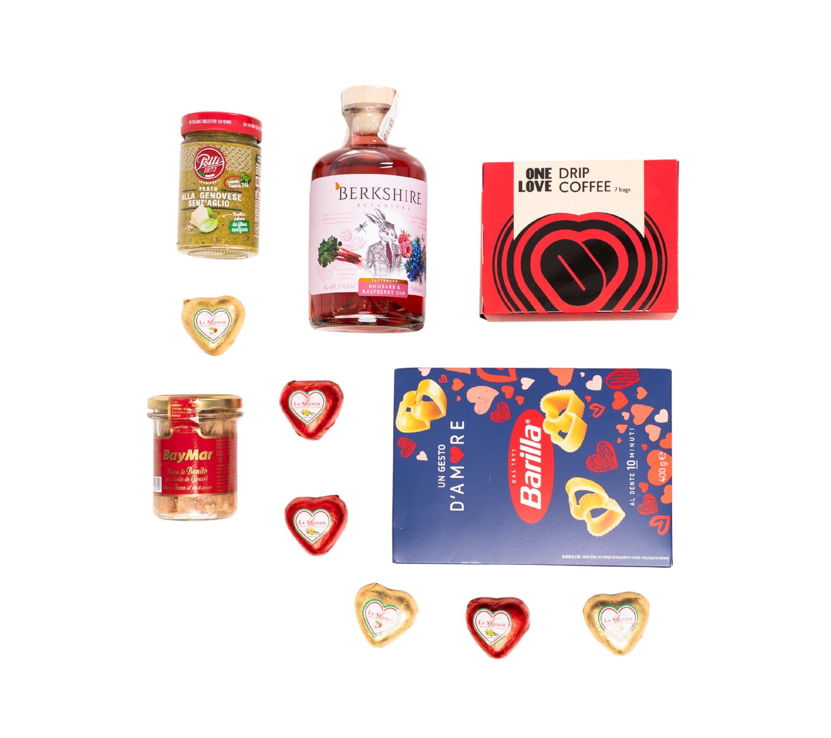 Коробка серце Гірлянда Джин Berkshire Botanical Rhubarb & Raspberry Макарони Barilla Pasta Love Кава Дріп One Love (mix box) Соус Pesto Polli alla genovese senz’ aglio Філе тунця BayMar в соняшниковій олії Сир твердий «Джюгас» Цукерки La Monde Heart 4 шт