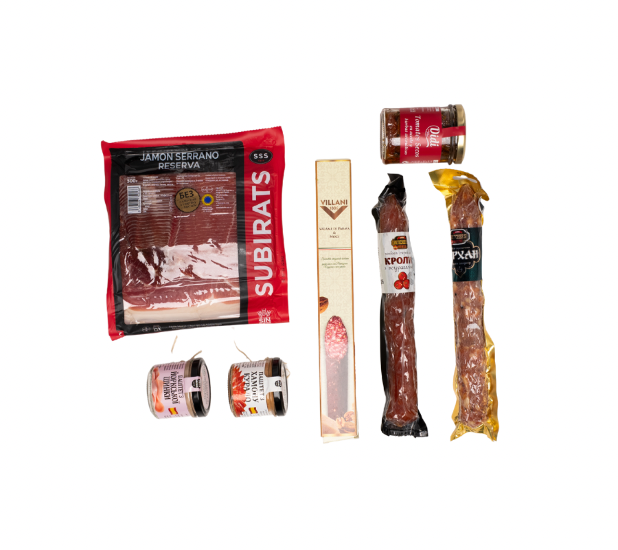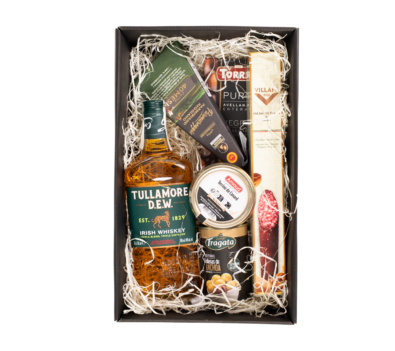 Віскі бленд Tullamore Dew Original Шоколад Torras чорний з фундуком Ковбаса з волоським горіхом та пармезаном Паштет качиний з арманьяком Оливки зелені з анчоусами Сир Парміджано Реджано