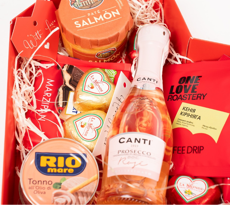 Вино Prosecco Millesimato Розе Canti 0,2 л Тунець Rio Mare в оливковій олії Паштет лососевий Кава Drip One Love 2 шт Шоколад Ritter Sport марципан Цукерки La Monde Heart 4 шт