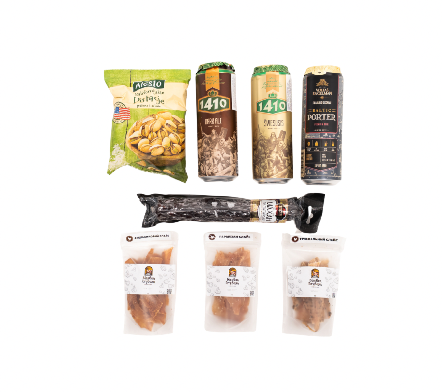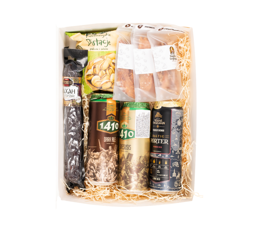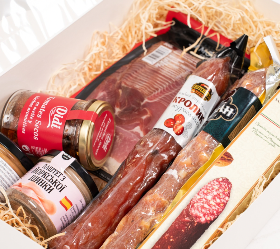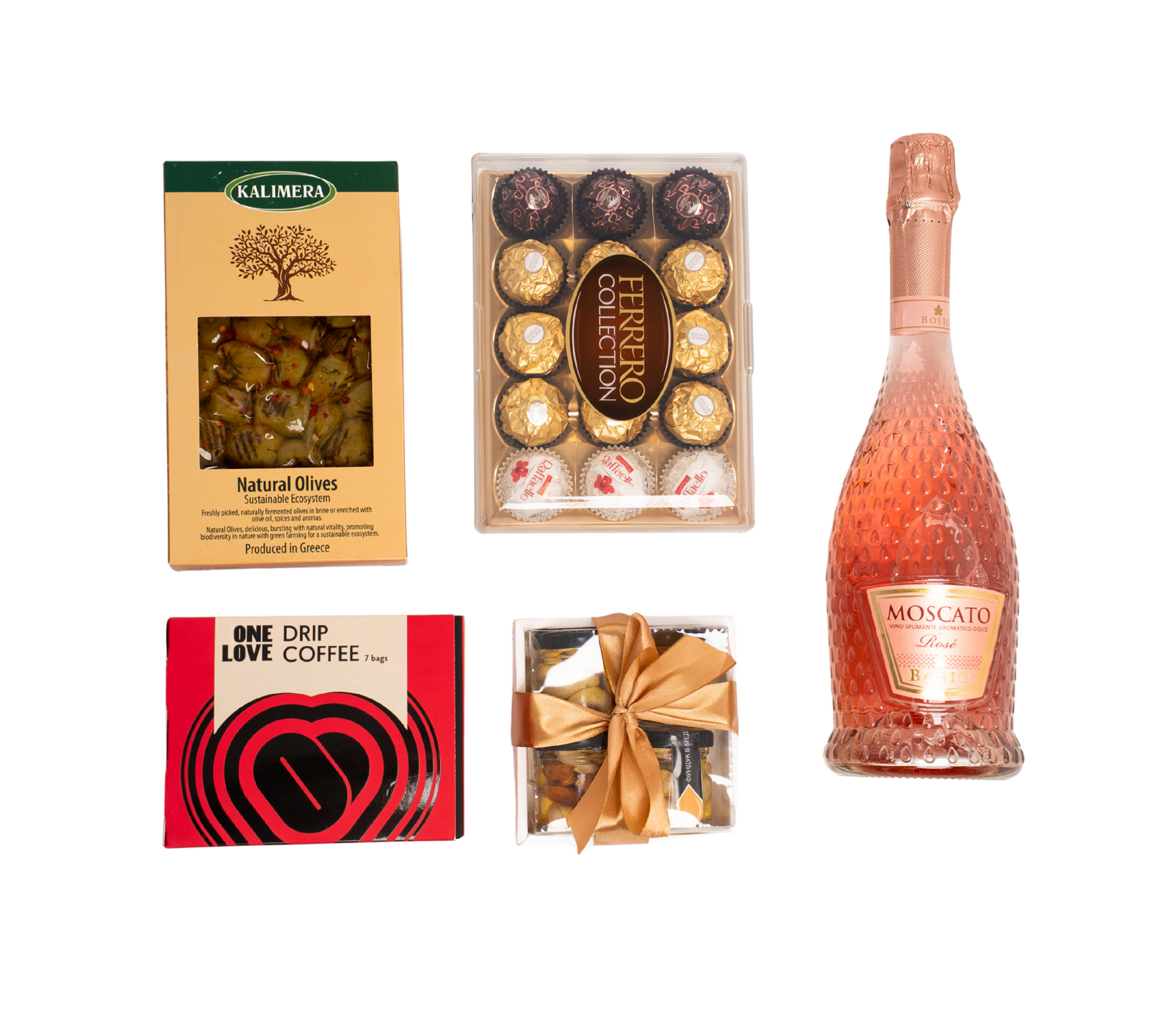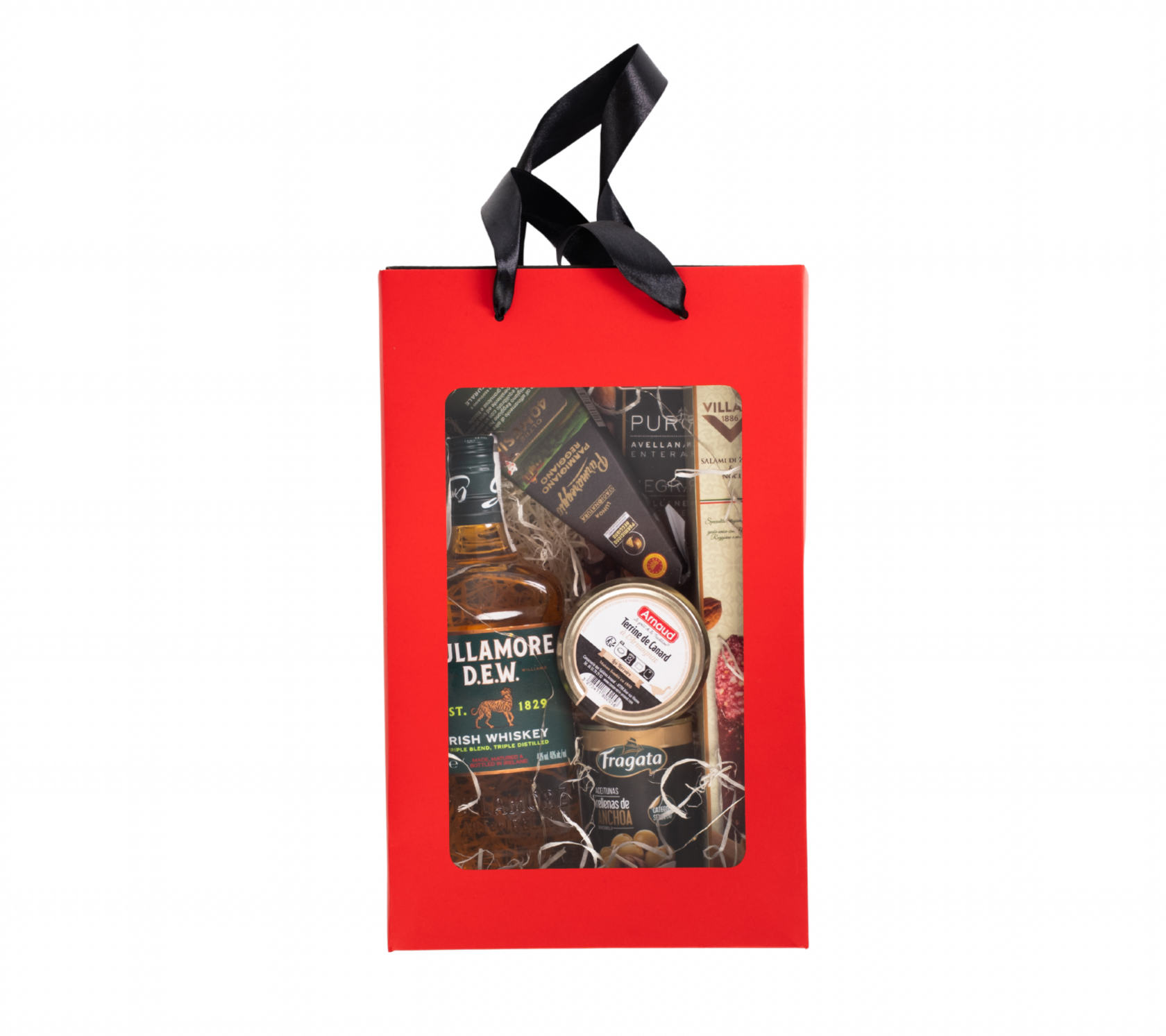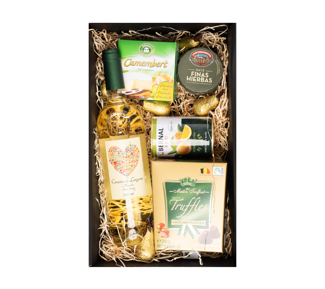 1.Подарункова корзина 2.Подарункове пакування товару 3.Ковбаса Курхан з фісташкою Butcher`s House 250 г 4.Ковбаса Салямі Capputa Olive 290 г 5.Цукерки ABTEY selection Liqueurs в асортименті 155г 6.Кукуруза консервована Taste of Asia 190 г 7.Тунець Larte Альбакор в оливковій олії 200г 8.Паштет з травами TM PATA NEGRA 110г 9.Віскі Спейсбокс чоколат MDF 0,75 л 10.Олія оливкова Costa d`Oro Extra Virgin 1 л 11.Шоколад молочний Torras №237 з фундуком 200 г 12.Цукерки Maitre Truffout Assorted Belgian Pralines Dark 200 г 13.Кава Movenpick Espresso 1 кг Солодощі, аромат кави та ігристе для чарівного настрою.