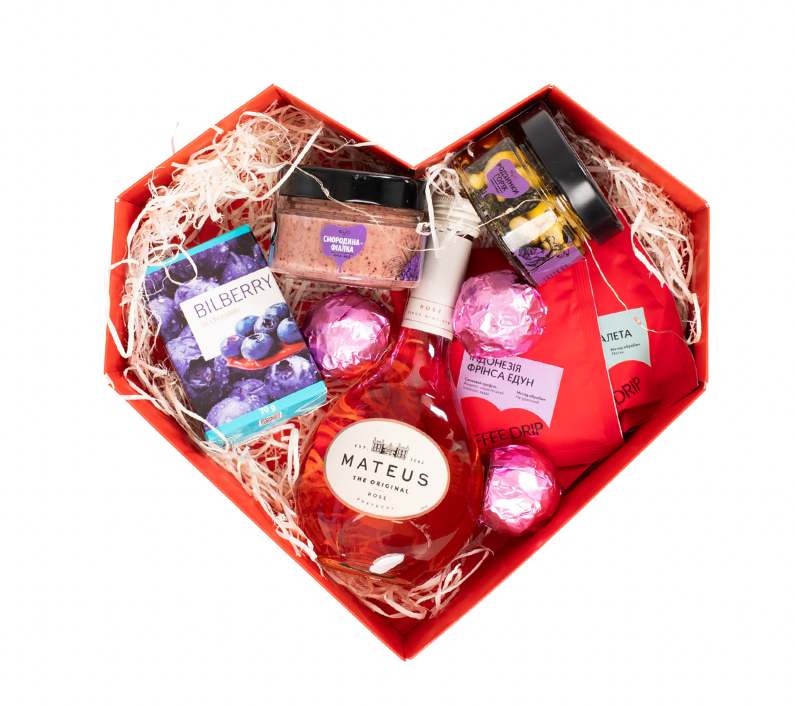 Коробка серце Гірлянда Вино Mateus Rose напівсухе рожеве 0,25 л Цукерки «Чорниця в шоколаді» Кава Дріп One Love 2 шт Honey BDJO «Фундук в меду» Honey BDJO Крем-мед «Смородина-фіалка» Цукерки La Monde Heart 5 шт