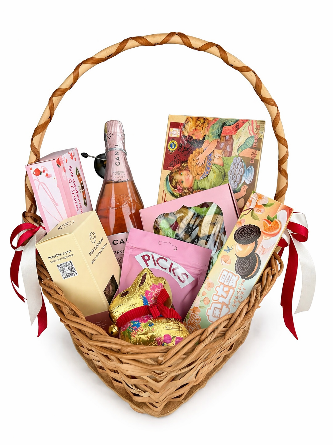 1.Кошик серце 2.Подарункове пакування товару 3.Міні іграшка ведмедик 12 см 4.Духи дитячі Disney 50 мл в асортименті 5.Жувальна гумка Hubba Bubba Cola 56 г 6.Шоколадна паста Nutella 25 г 7.Драже JohnyBee "WATCH" 14 г 8.Драже M&M шоколадні яйця 70 г 9.Шампанське дитяче 0,75 л 10.Гель для душу Chupa Chups в асортименті 300 мл 11.Цукерки Paw Patrol/SpongeBob Браслет годинник 10 г 12.Желейки Haribo Pasta Penne 160 г Ідеальний подарунок для малечі.